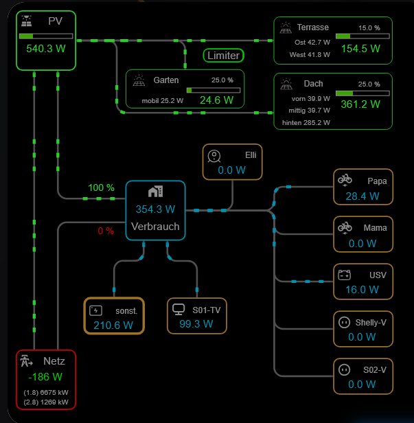 Um den Gesamtverbrauch zu ermitteln müssen Sie lediglich Ihren digitalen Stromzähler "smart" machen. Nutzen Sie hierfür einfach die optische Schnittstelle des Zählers in Verbindung mit einem IR-Wifi-Lesekopf. Dieser ist magnetisch und wird einfach auf die IR-Schnittstelle Ihres Stromzählers gesetzt. Der Lesekopf liefert u.a. den aktuellen Verbrauch via MQTT an Ihre Smarthomesteuerung (ggf. müssen Sie Ihren Stromzähler via GIN freischalten - die GIN erhalten Sie kostenfrei auf Anfrage bei Ihrem Messstellenbetreiber). Um den Wert der Stromerzeugung zu ermitteln empfiehlt sich Shelly PM Mini Gen. 3 oder Shelly EM mit Messklemme. Dieses wird an den AC-Anschluss des Wechselrichters geklemmt und sendet ebenfalls die von ihm gemessenen Werte. Setzen Sie nun Verbrauch und Erzeugung in Bezug zu einander so können Sie Ihren Stromverbrauch automatisch der Erzeugung, in gewissem Rahmen anpassen. |